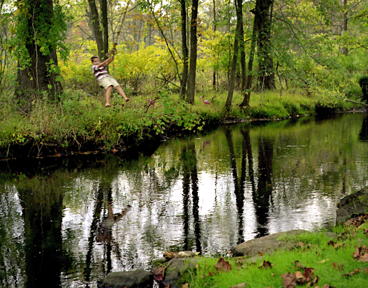 My computer's not fixed yet, but i kinda found a workaround with my mac, and going back to big time basics, as far as HTML & new uploads. Its kinda fun to do everything so manually though. Here's a shot of my cousin Alex swinging across the creek. There wont be too many more days to do this. |